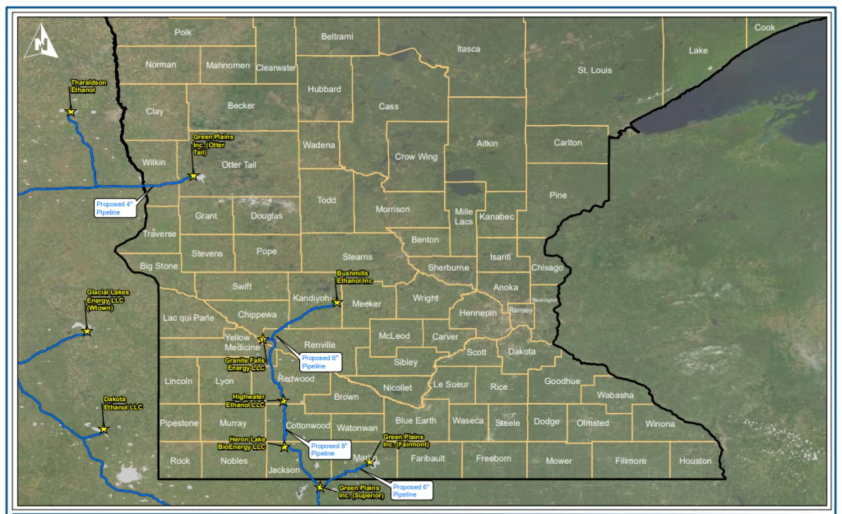 The company behind the pipeline, Summit Carbon Solutions, has so far only filed for a route permit application for a 20 mile stretch in those two counties, running from the Green Plains ethanol plant at Fergus Falls, Minnesota, to the North Dakota state line.